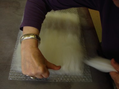 | hold the wool tops gently in one hand and pull off small tufts with the other hand |