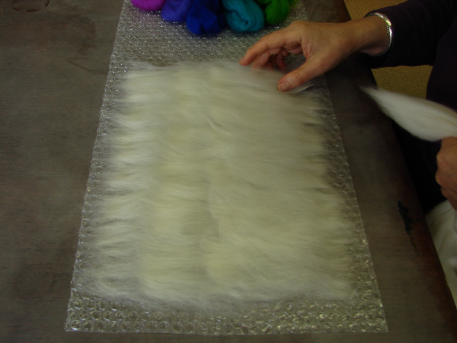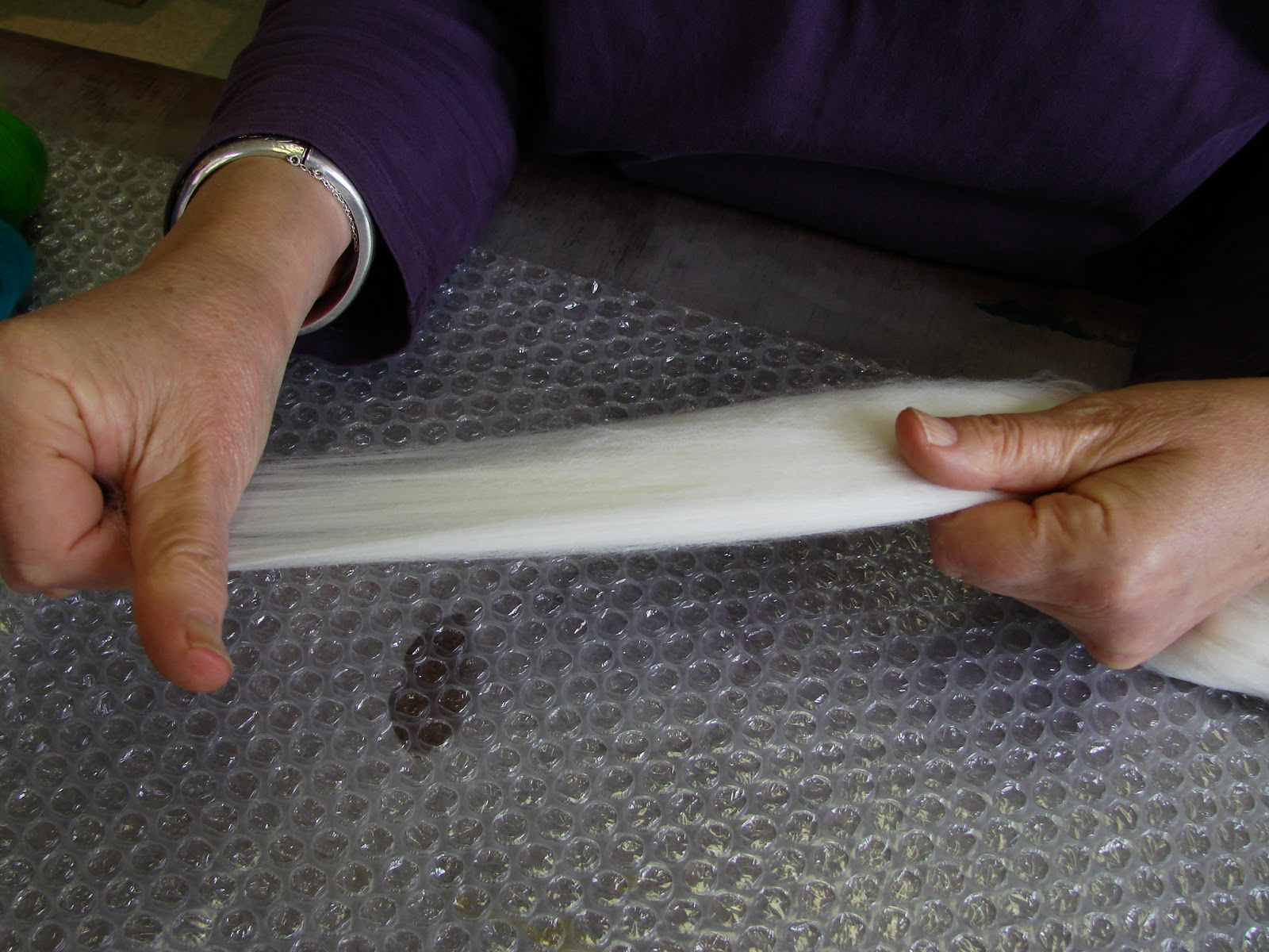 I thought perhaps some folks might be interested in tips from Mum and I about how to make felt. So here is the first “Felting Tip” from Diva Designs. Photos from me, hands in action from Christine – Mum!