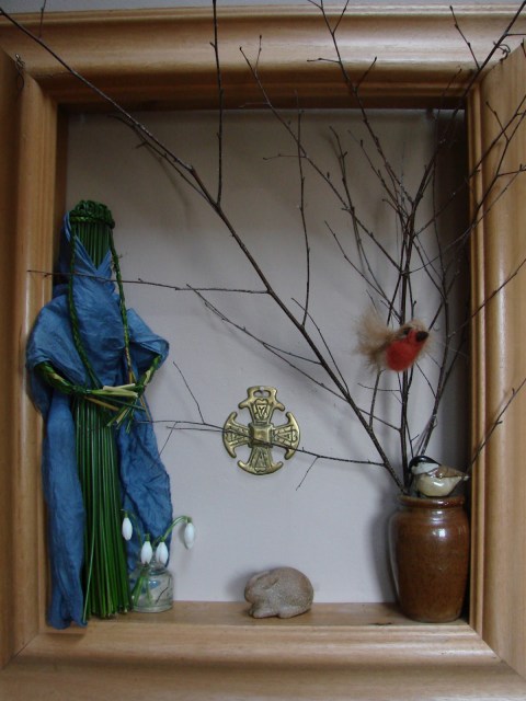 Over on the East and in the present day I was introduced to the Brideag (sounds like Bree-og) as a guardian figure made of green rushes and wrapped in a cloth. Blue is sacred to Bride and I use a blue silk scarf that belonged to my beloved Granny.