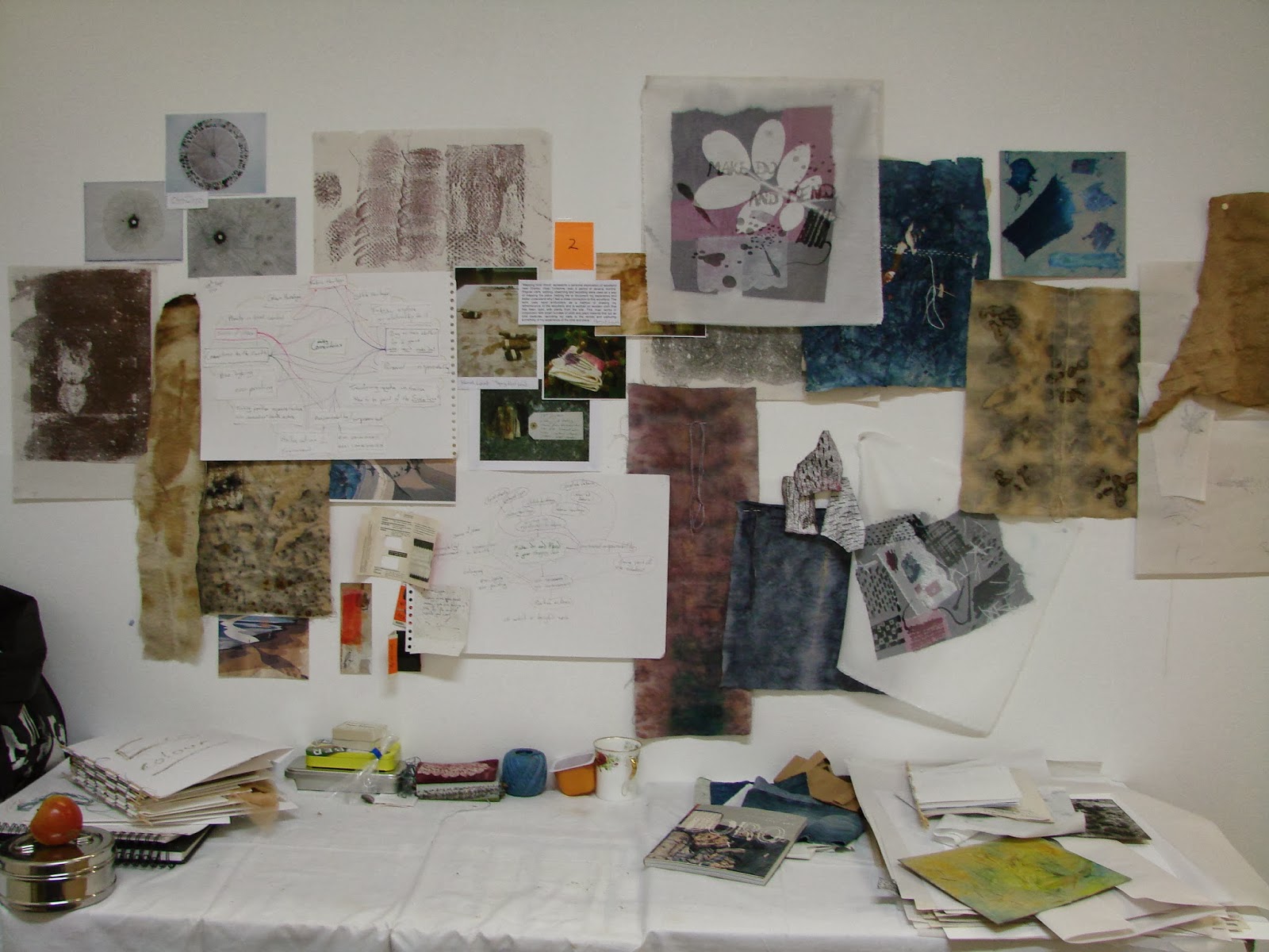 I am settling into “Studio Practice” at Moray School of Art; it’s starting to feel like I’m heading in an interesting direction through my explorations with printmaking, and just generally finding my feet in this second year. My studio space is constantly evolving and changing, and my tutor suggested that I keep a record by taking photos each time I take stuff down, put stuff up or just shuffle things around as I make new connections. This is the first photo of my evolving visual thought process, complete with pictures and quotes from artists who inspire me, and a whole mix of mono-printing, eco-printing, transfer printing and notes/mind maps. Bit of a jungle really, but sense of purpose is emerging gradually!