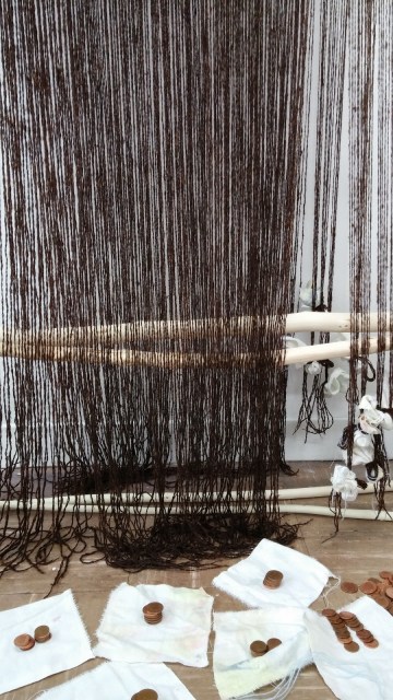 So as it turns out, that stash of coins is perfect for weighting the warp of my loom – 12p per 5 warp threads tied up in a scrap of recycled fabric.