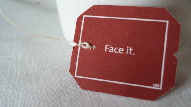 I do enjoy yogi tea. Most times the tags have a gentle loving message on them, always an added bonus. Not this time! Face it: deadlines are rapidly approaching. Face it: you get out what you put in. Face it: do the hard things before they become impossible.