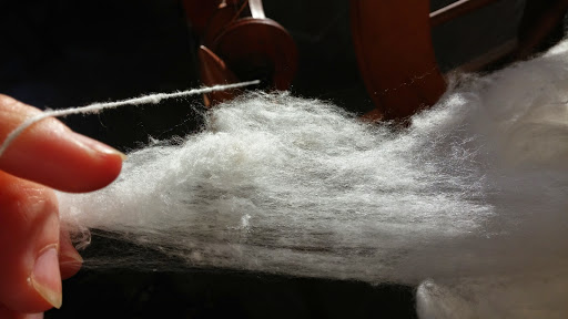 Spun silk: doesn’t that conjure up something luxuriously soft and lovely? It sure doesn’t make me think of something likely to slice my hands as I make it, but I have come so close to doing just that as I learn how to handle this delightfully soft but fearsomely strong cloud of fibre. The finer I spin the sharper it becomes. I can only work on this in short bursts as I have to rest my hands frequently: the strength of silk taxes my hand joints and muscles and I’m risking a flare-up of RSI. But it’s so beautiful, so soft, so warm…. And I want it to make a projector screen from in my studio.
