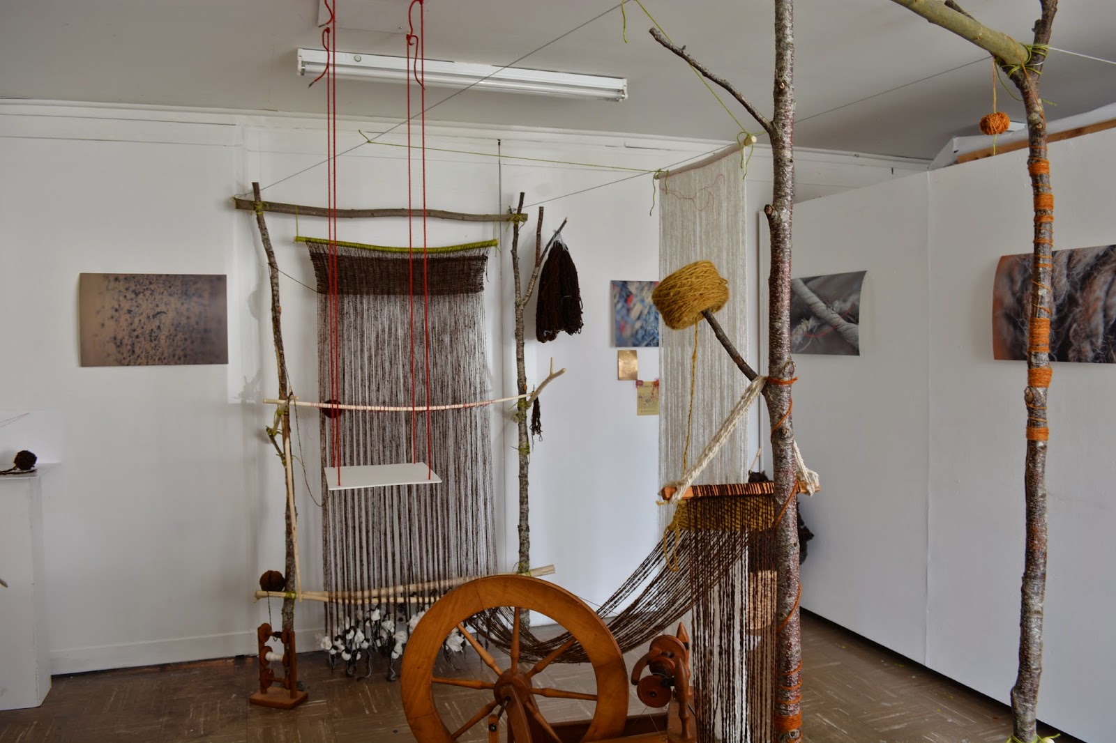 Here’s a wee glimpse of how my studio looked all set up for marking. Sadly I haven’t got a picture with the projector on the go as I was sharing it with another student. It should be standing on the white platform hanging from red cords and projecting film onto the white silk warp.